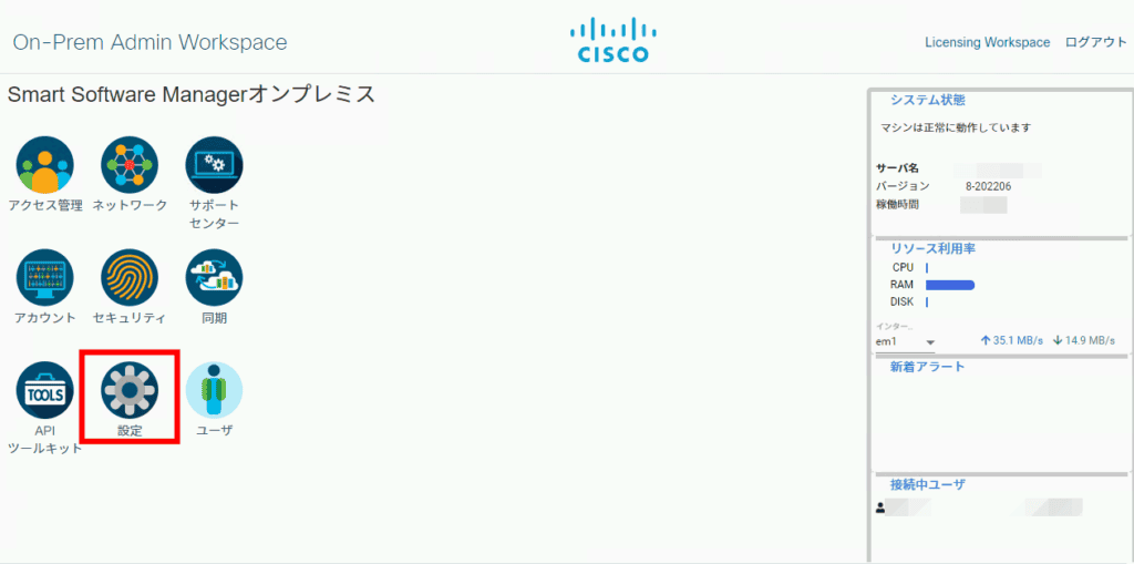 CSSMオンプレミスのWebUIで、管理者ワークスペースの「設定」を選択します。