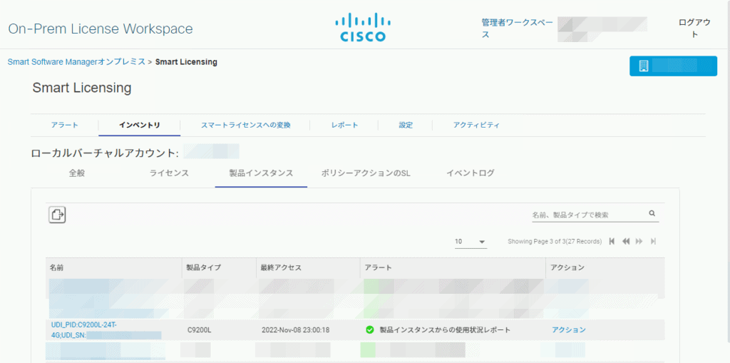 Last report file write: <none>CSLU(CSSMオンプレミス)でレポートを受信すると、以下のように製品インスタンスが自動的に登録されます。