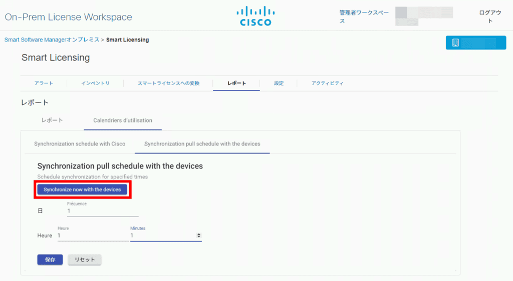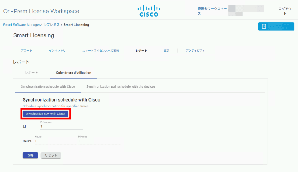 CSLU(CSSMオンプレミス版)とCSSMは、デフォルトだと毎日AM01:01に自動同期されるように設定されており、レポート送信もこのタイミングで行われます。自動同期されるまで待つのが面倒だという場合は、以下をクリックすることで手動同期させることも可能です。