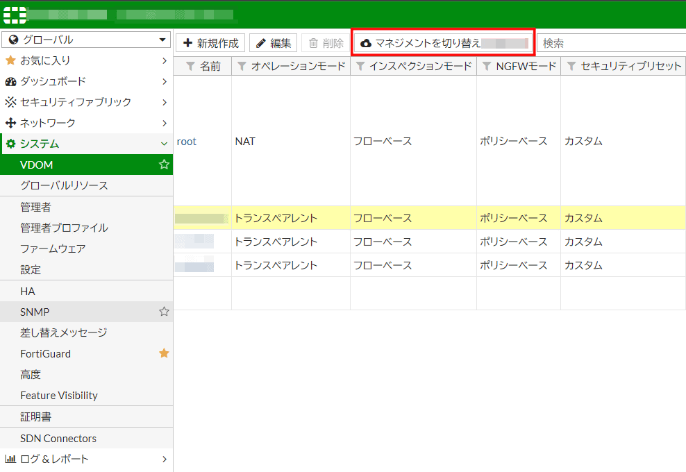 VDOMを設定している場合、ライセンスアクティベートの通信(FortiGuardへの通信)はマネジメントVDOMから行われます。 通常はroot VDOMマネジメントVDOMとなっていますが、root VDOMからインターネットへ通信できない場合は、グローバルシステムVDOMマネジメントを切り替えからインターネットへ通信できるVDOMへ、マネジメントVDOMを変更する必要があります。