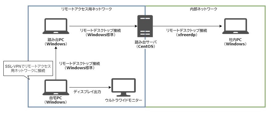 その自宅のPCからSSL-VPNで社内のリモートアクセス用ネットワークに接続後、自宅PC(Windows)→踏み台PC(Windows)→踏み台サーバ(CentOS)→社内PC(Windows)と順にリモートデスクトップ接続するような多段構成となっています。